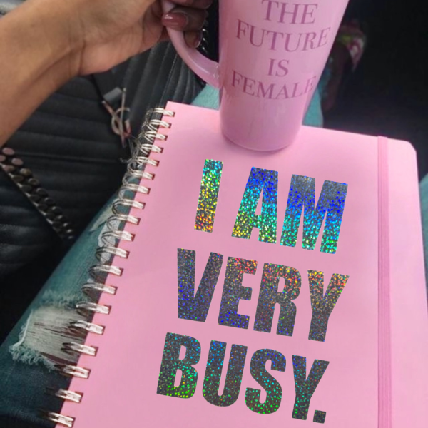 -PERSONALIZACION: Cuaderno con elastico del color del cuaderno, frase ´i am very busy´ en color tornasolado (LA FRASE QUE QUIERAS).